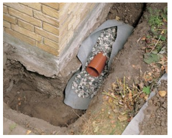 Ce procédé est le plus couramment utilisé. Il consiste à évacuer les eaux souterraines loin des soubassements, en mettant en place un drain perforé dans une tranchée en pente douce le long du mur sur son côté extérieur avec pour profondeur le niveau de la fondation.